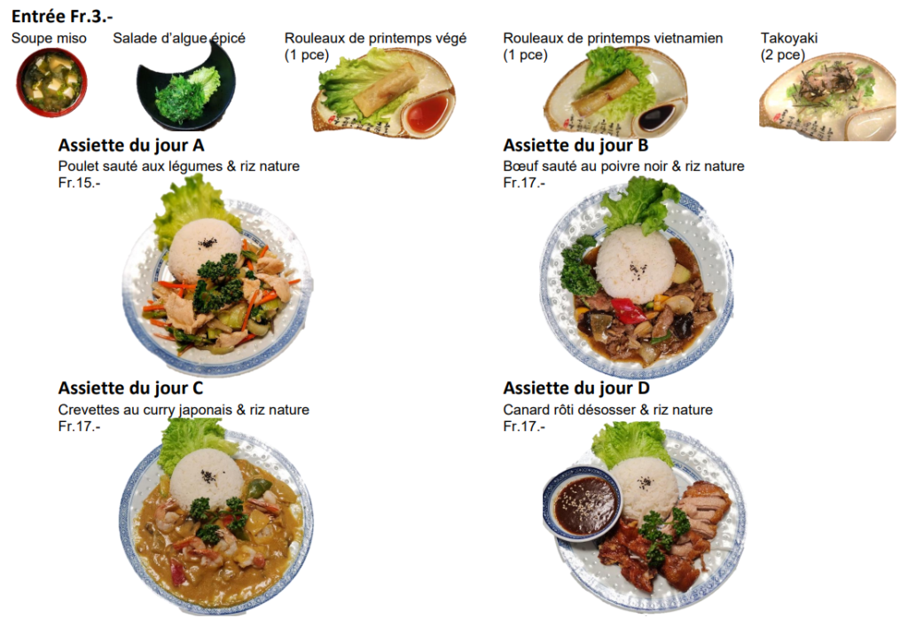 Plat à MIDI (lundi – vendredi) Nouveaux plats du jour !!!Nouveaux prix !!!Avec la Carte de fidélité, tous les plats du jour moins Fr.1.-